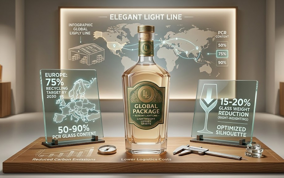 Sustainability is now an inextricable component of custom glass bottle design. In Europe, a 75% recycling target by 2030 is driving demand for bottles with 50-90% Post-Consumer Recycled (PCR) glass content (cullet). The industry is pivoting toward “right-weighting”—reducing glass weight by 15-20% through optimized silhouettes without sacrificing the “premium” tactile experience. For example, Global Package’s “Elegant Light Line” demonstrates that sophisticated silhouettes can reduce carbon emissions and logistics costs while maintaining shelf presence.