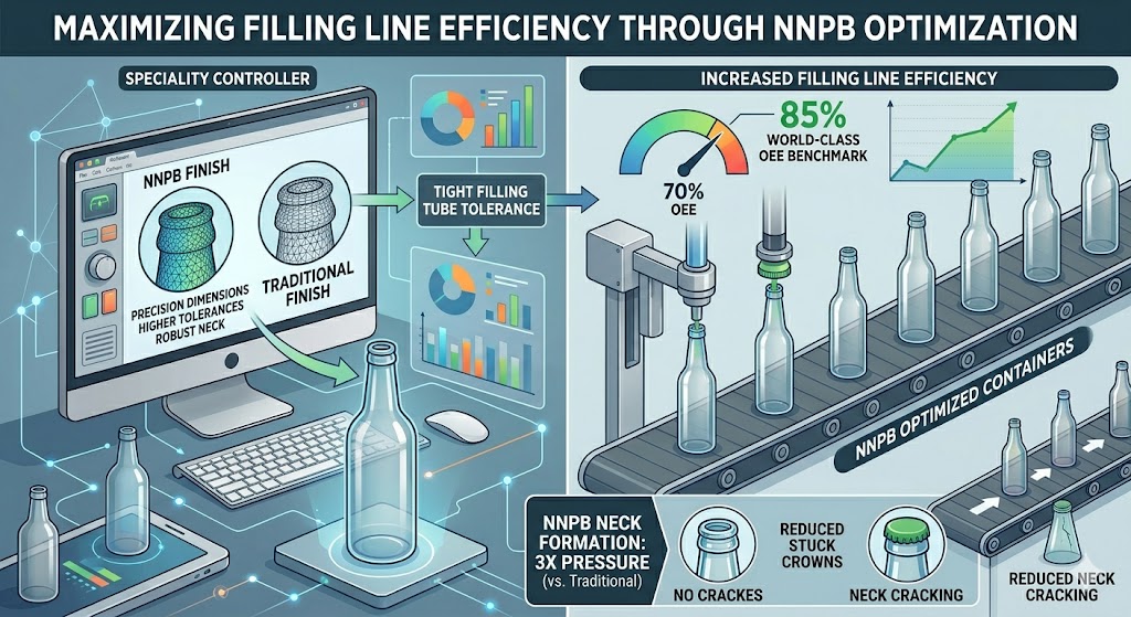 By utilizing NNPB, the predictable dimensions of the bottles—particularly the “finish” (neck) and height—allow for tighter tolerances in filling tubes and capping heads. Because the NNPB neck formation experiences three times the pressure of traditional methods, the resulting neck is significantly more robust, reducing the risk of “stuck crowns” or neck cracking. We predict that the transition to NNPB-optimized containers will drive a measurable increase in filling line efficiency, helping plants move toward the 85% world-class OEE benchmark.