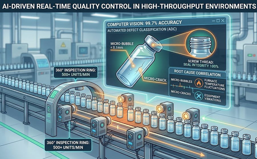 In high-throughput environments where production exceeds 500 units per minute, human inspection is mathematically incapable of maintaining the necessary 0.1% defect tolerance . Modern computer vision systems, trained on trillions of images, now perform 360° inspections at line speeds with a 99.7% accuracy rate. This technology has evolved beyond simple “reject/accept” logic to “Automated Defect Classification” (ADC). By identifying 0.1mm micro-cracks and bubbles in real-time, the system understands the root cause of the flaw, correlating surface imperfections with furnace temperature fluctuations or equipment vibrations . In specialized pharmaceutical glass, for instance, now monitors the screw threads of vials with 100% accuracy, ensuring seal integrity that is critical for shelf-life stability.