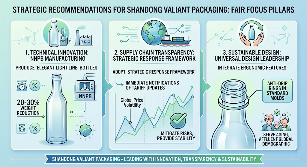 Strategic recommendations for Shandong Valiant Packaging during the fair focus on three pillars: technical innovation, supply chain transparency, and sustainable design. First, the company should highlight its NNPB manufacturing capabilities to produce “Elegant Light Line” bottles that offer a 20-30% weight reduction . Second, in response to global price volatility, Shandong Valiant Packaging should adopt the “Strategic Response Framework” of providing immediate notifications of tariff updates. Finally, we must lead in “Universal Design,” integrating ergonomic features such as anti-drip rings into our standard mold offerings to serve an aging but affluent global demographic.