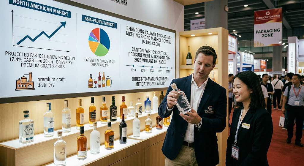 The North American market is projected to be the fastest-growing region for alcoholic beverage packaging with a CAGR of 7.4% through 2030, driven by the continued premiumization of craft spirits . In contrast, the Asia-Pacific region continues to hold the largest market share at 33.1% . Within this landscape, Shandong Valiant Packaging is positioning its high-flint and crystal-white glass solutions to meet the 5.19% CAGR expected for the broader alcohol packaging market through 2030 . The timing of the 139th Canton Fair is also critical for the wine industry, aligning with mid-cycle procurement needs for 2026 vintage releases, allowing Shandong Valiant Packaging to facilitate a direct-to-manufacturer environment essential for mitigating the risks associated with raw material price volatility.
