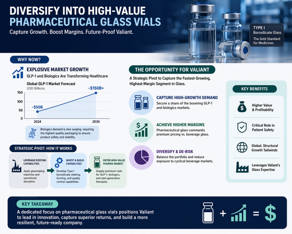 Diversify into High-Value Pharmaceutical Glass Vials: Given the explosive growth of the GLP-1 and biologics markets, Valiant should consider a strategic pivot or dedicated division for Type I borosilicate glass production. This would allow the company to capture a share of the fastest-growing and highest-margin segment of the global glass industry, diversifying the portfolio away from the more cyclical beverage market.