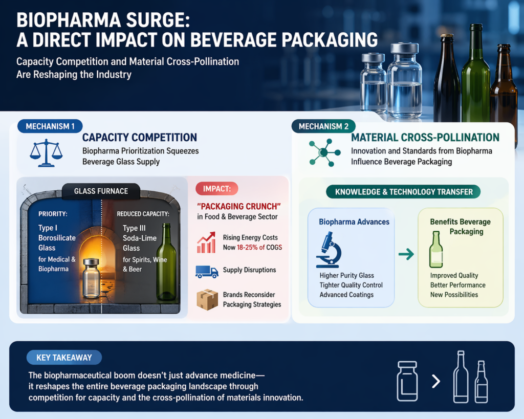 The biopharmaceutical surge exerts a direct and multifaceted impact on the beverage packaging industry, primarily through the mechanisms of capacity competition and material cross-pollination. As global glass manufacturers prioritize the production of Type I borosilicate glass for medical use, the available furnace capacity for traditional Type III soda-lime glass—the mainstay of the spirits, wine, and beer industries—is being squeezed. This has led to a “packaging crunch” in the food and beverage sector, where rising energy costs (now representing 18-25% of COGS) and supply disruptions are forcing brands to reconsider their packaging strategies.
