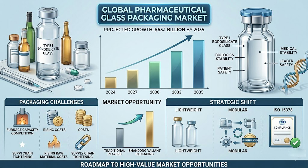 The rapid advancement of the biopharmaceutical industry, particularly the projected growth of the global pharmaceutical glass packaging market to $63.1 billion by 2035, is reshaping the strategic priorities of the glass manufacturing world. This surge is driven by a massive pipeline of biologics and biosimilars that require specialized Type I borosilicate glass to maintain product stability and patient safety. For the alcoholic beverage packaging industry, this development manifests as a significant “packaging crunch,” characterized by heightened competition for energy-intensive furnace capacity, rising raw material costs, and a tightening of global supply chains. The direct relevance to Shandong Valiant Packaging lies in the shared manufacturing ecosystem; as global leaders like SCHOTT and Gerresheimer pivot toward high-margin medical containers, a supply vacuum is created in the premium spirits and wine sectors that only technologically advanced, compliant manufacturers can fill. This report explores how the biopharmaceutical boom necessitates a shift toward “Lightweight Luxury,” modular manufacturing, and ISO 15378 compliance, offering a roadmap for B2B exporters to capture high-value opportunities in a supply-constrained environment.