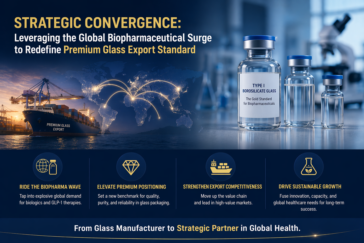 The rapid advancement of the biopharmaceutical industry, particularly the projected growth of the global pharmaceutical glass packaging market to $63.1 billion by 2035, is reshaping the strategic priorities of the glass manufacturing world. This surge is driven by a massive pipeline of biologics and biosimilars that require specialized Type I borosilicate glass to maintain product stability and patient safety. For the alcoholic beverage packaging industry, this development manifests as a significant “packaging crunch,” characterized by heightened competition for energy-intensive furnace capacity, rising raw material costs, and a tightening of global supply chains. The direct relevance to Shandong Valiant Packaging lies in the shared manufacturing ecosystem; as global leaders like SCHOTT and Gerresheimer pivot toward high-margin medical containers, a supply vacuum is created in the premium spirits and wine sectors that only technologically advanced, compliant manufacturers can fill. This report explores how the biopharmaceutical boom necessitates a shift toward “Lightweight Luxury,” modular manufacturing, and ISO 15378 compliance, offering a roadmap for B2B exporters to capture high-value opportunities in a supply-constrained environment.